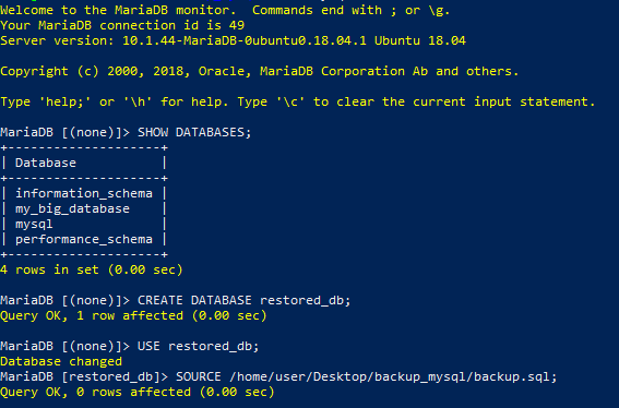 Questo comando creerà il database “restored_db”: sostituiscilo con un nome a tua scelta. È importante comunque che non vi sia già un database con quel nome: in tal caso otterresti un messaggio di errore e dovrai ripetere l’operazione indicando un nuovo nome.