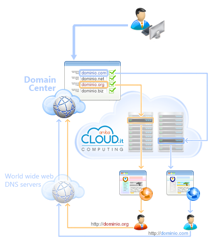 Per tutti i domini presenti su Domain Center è possibile abilitare la Gestione DNS: questo permette di avere la massima gestione del dominio e di poter trattare e instradare tutte le tipologie di richieste e di traffico web. Attraverso l'interfaccia di gestione del DNS di Domain Center è possibile editare qualsiasi tipo di record DNS e in qualsiasi momento è possibile aggiungere o rimuovere o editarne il contenuto. L'interfaccia di gestione permette inoltre di importare e/o esportare tutti i parametri e record della gestione in un file di testo: questo semplifica moltissimo il salvataggio e il ripristino di particolari configurazioni. L'interfaccia di gestione del DNS è integrata con tutti gli altri prodotti Cloud.it permettendo di individuare con semplicità i propri indirizzi IP e i propri Cloud Server nella propria infrastruttura Cloud Computing. Tuttavia è possibile inserire nei record DNS indirizzi IP verso infrastrutture esterne all'infrastruttura Aruba Cloud. I record DNS gestibili sono: